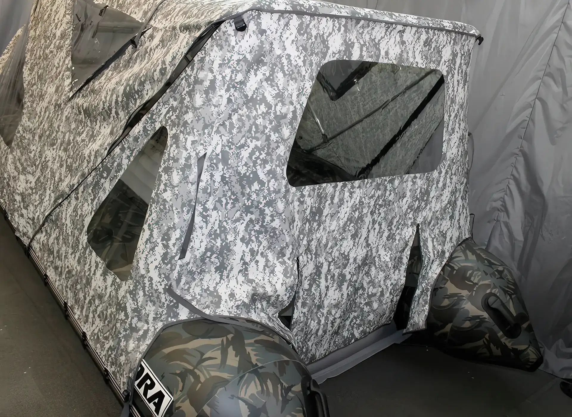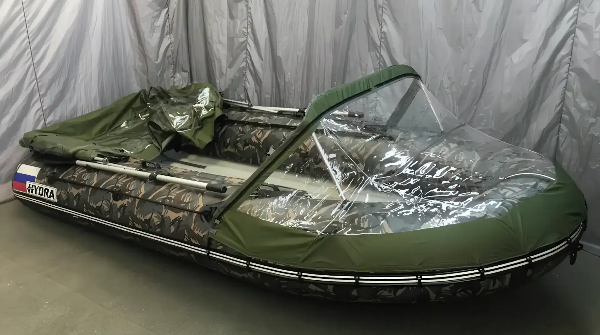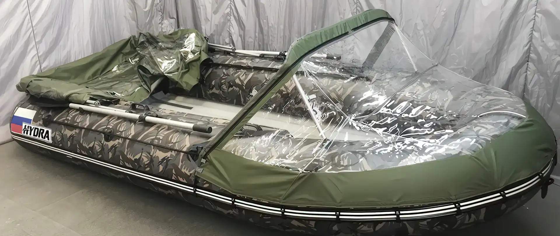 Универсальный тент ходовой кабриолетного типа за считанные минуты собирается на лодке «HYDRA» в надежное укрытие от непогоды или трансформируется в обычный носовой тент прямо на воде.